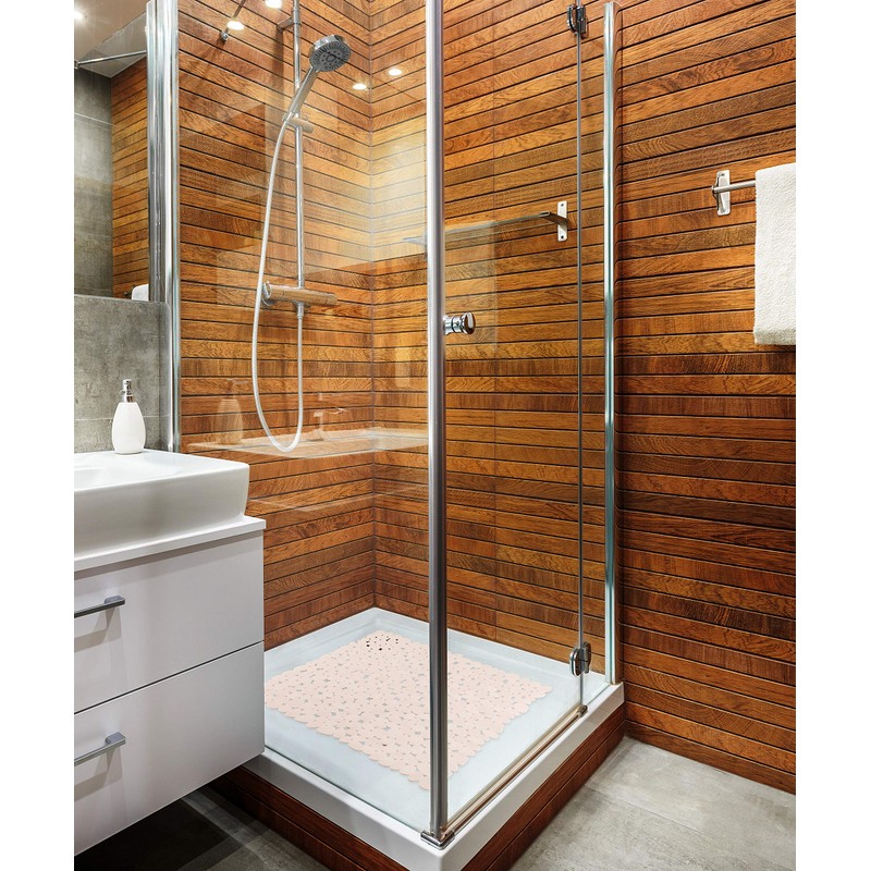 Matching your bathroom decor, you will receive a cream stone look mat for the shower in the size 53 x 53 cm. Non-slip soft plastic.