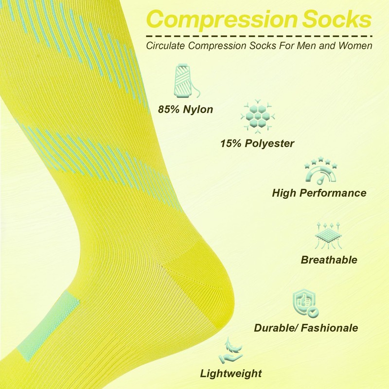 • ✅ ✅ **SUPPORT RECOVERY AND PAIN RELIEF:** Circulate Compression Socks promote blood circulation and oxygen flow, reducing fatigue, swelling, and varicose veins through mild compression. They stimulate oxygen delivery to muscles and enhance airflow, aiding joint and muscle recovery while providing rejuvenating relief from pain and discomfort.