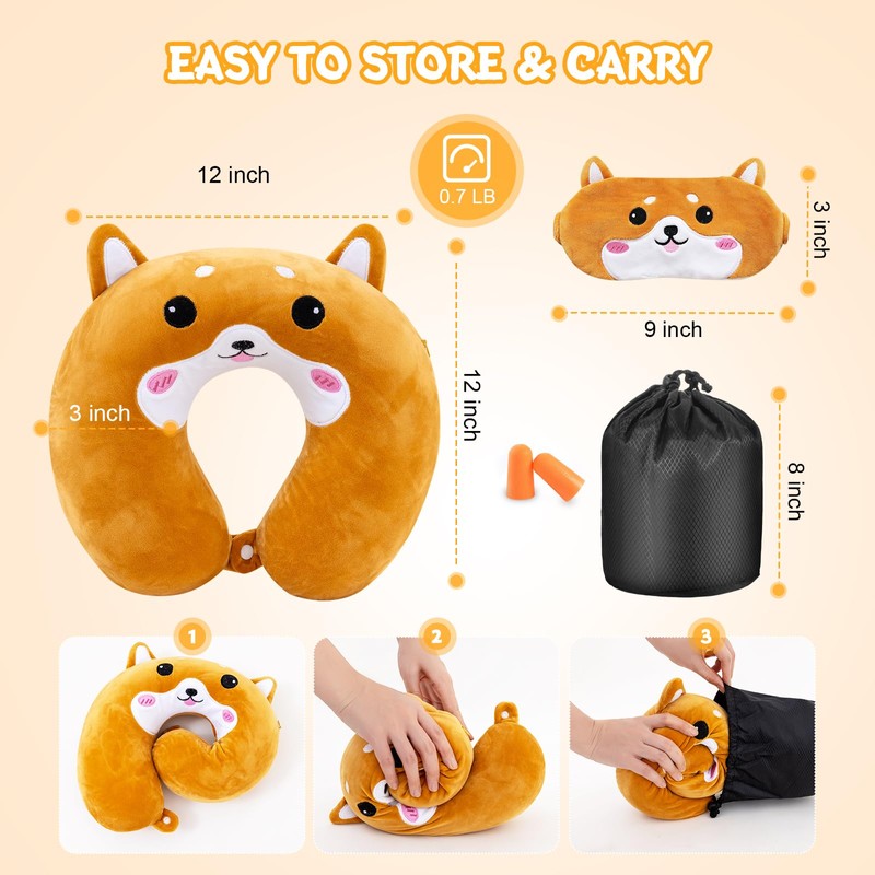 Cirorld Travel Pillow for Kids Adult Cute Neck Pillow for Traveling Memory Foam Airplane Pillow Sleep Mask Animal Flight Pillow Head Rest Neck Support for Cars Long Flights (Dog, 9-12 Y/O)