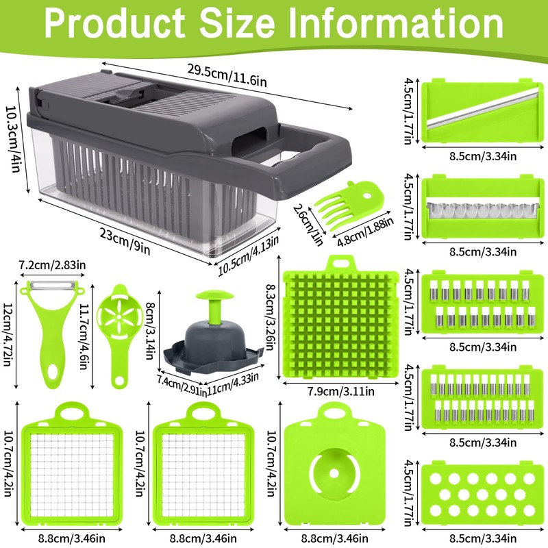 • ob Sie eine einfache Salat-Zubereitung vorhaben, ein umfangreiches Familienessen kochen oder Spezialitäten zubereiten möchten-gemüsezerkleinerer kann Obst, Gemüse, Käse und vieles mehr in verschiedene Formen und Größen schneiden, würfeln und raspeln. multifunktionaler gemüseschneider ideale Werkzeug für jeden Koch, egal ob Anfänger oder Profi.