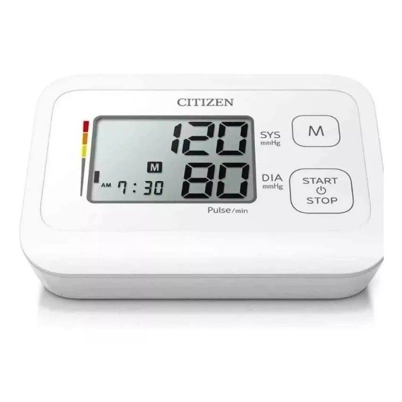 Medidor Citizen de presión arterial digital y automático para uso en brazo, con diseño moderno de color blanco.