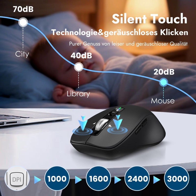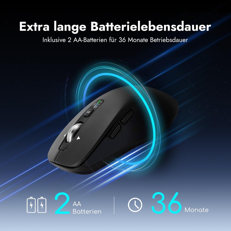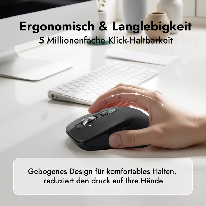 • Multigeräte-Verbindung: Die kabellose maus kann mit 3 Geräten verbunden werden (2.4G USB+ Bluetooth*2). Sie können mit einem einzigen tastendruck zwischen den 3 Geräten wechseln.