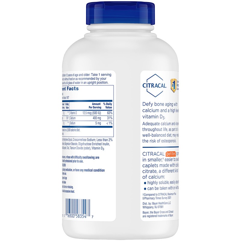 Citracal Petites sugar free Calcium Citrate caplets are designed to provide the calcium and vitamin D3 you may not get enough of from the foods you eat each day. Calcium is an essential mineral needed for bone health.* Add Citracal Petites as part of your daily regimen to support strong bones.* Vitamin D3 promotes calcium absorption. Citracal Petites contains 400 mg of calcium and 500 IU of vitamin D3 per serving to help achieve optimal bone health and defy bone aging. They are smaller and easier to swallow compared to Citracal Maximum Plus and can be taken with or without food. Citracal is the #1 Doctor and Pharmacist‡ recommended calcium brand. So, whether you’re 19 or 90, talk to your doctor about adding Citracal Petites to your diet and overall wellness and fitness regimen to help support bone health. This statement has not been evaluated by the Food and Drug Administration. This product is not intended to diagnose, treat, cure, or prevent any disease.