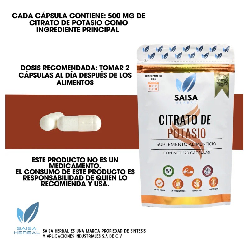 Citrato De Potasio 2 bolsas con 120 capsulas c/u. | Suplemento Alimenticio | Alta Biodisponibilidad | Saisa Herbal | Ayuda A Prevenir Cálculos Renales, Salud Cardiovascular, Evita Calambres