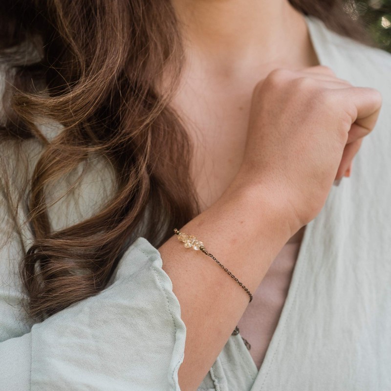 - The dainty bracelet features a row of yellow citrine chip beads alongside two metal beads