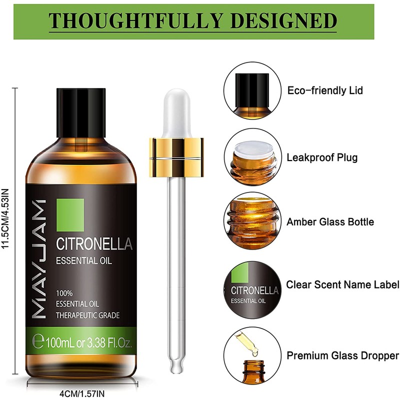 - Thoughtful Design: Each Citronella essential oil is bottled in 100ML amber glass bottle to help keep the fragrance lasting. It also comes with a premium quality glass dropper to help you get the exact amount you desire.