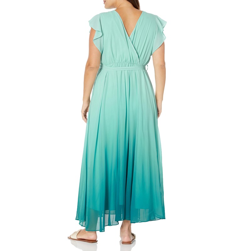 - Drape your curves in the stylish new Isabella Maxi Dress! Key Features Include: - V-neckline - Short flutter sleeves - Faux wrap closure - Silky satin-feel lining - Removable fabric waist tie - Fit-and-flare silhouette - Ombre design - Maxi hemline