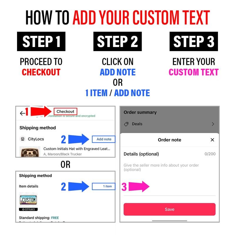 (Add your custom text in the "Add Note" Section or send us a message with your desired text.)