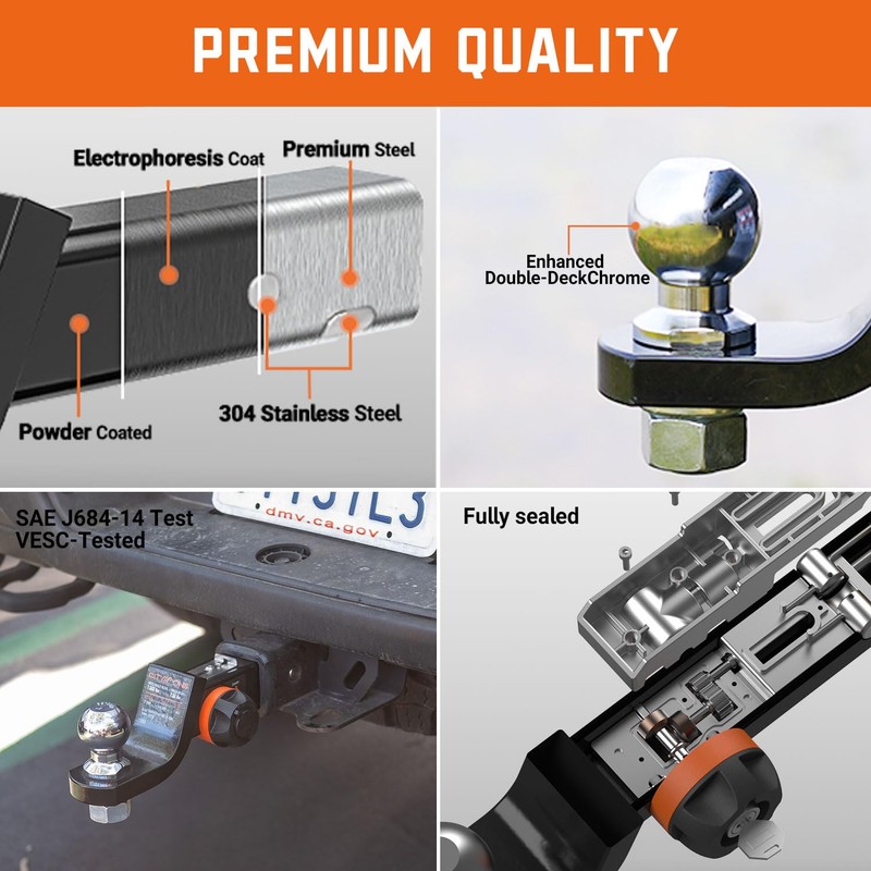 - Premium Quality-Made with top-grade steel, our hitch boasts an electrophoresis and powder-coated finish. Fully sealed and filled with non-freezing grease for durability and reliability. After extensive all-terrain testing, it exceeds SAE J684-14 and VESC standards.