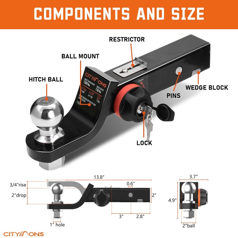 Citymons Endo-Hitch Trailer Ball Mount, Reduce Sway Anti-Rattle, 2" Drop Hitch with 2" Ball for 2" Receiver, Tow Hitch with Lock for Rv/Truck/Yachts/ATV/UTV, 7500 LBS GTW