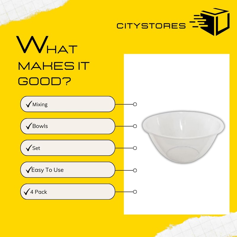 citystores Set of 4 Mixing Bowls 15 20 25 30cm Mixing Bowl Plastic Clear Cooking Baking Food Preparation 1l 2.3l 4l 7l