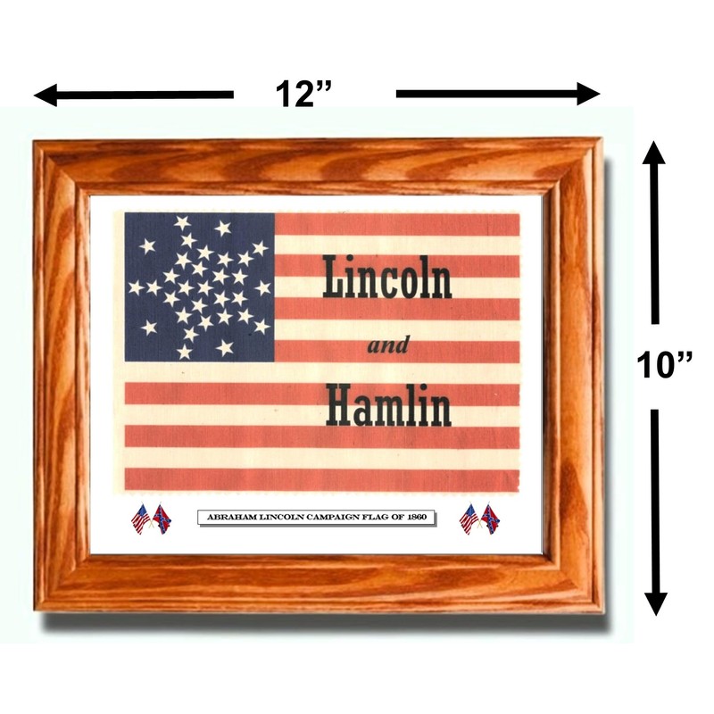 - 1860 ABRAHAM LINCOLN CAMPAIGN FLAG Homemade Flag is printed on cotton muslin Solid wood American made 10" x 12" Oak frame ready for wall hanging. Custom made to order in the USA