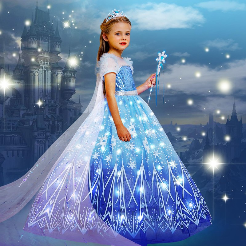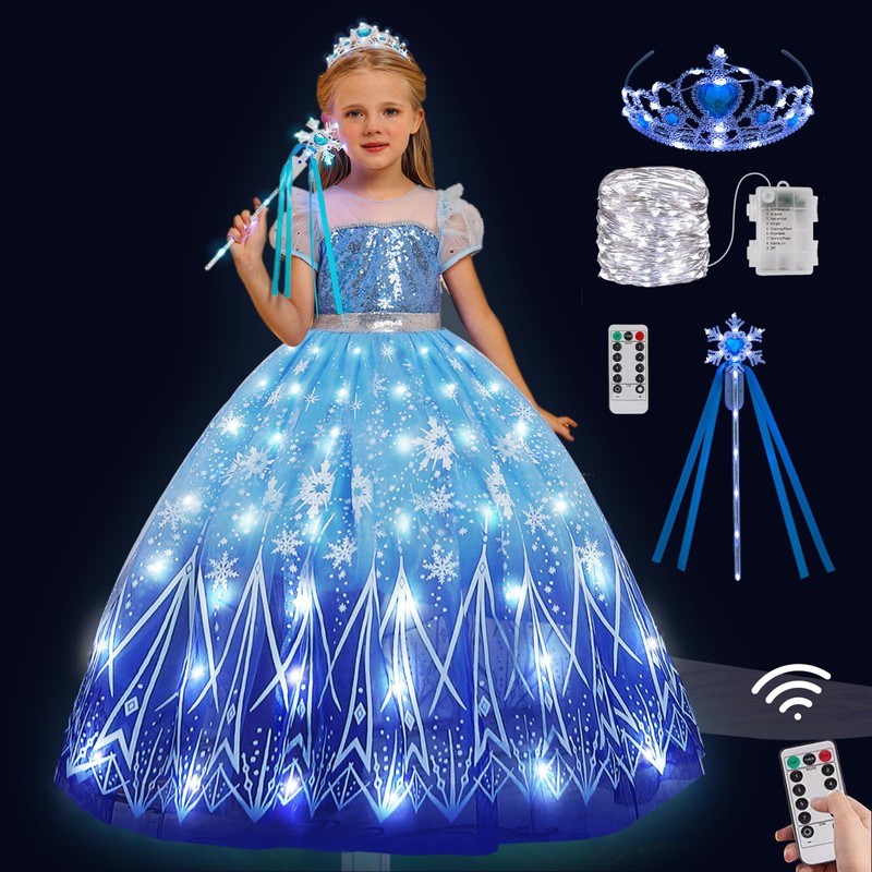 - Glowing Princess Costume: This glowing elsa princess dress is magical and elegant. The LED glow makes this princess dress dreamy and beautiful when turned on in the dark, lighting up the night and making your little girl the standout princess at the night party.