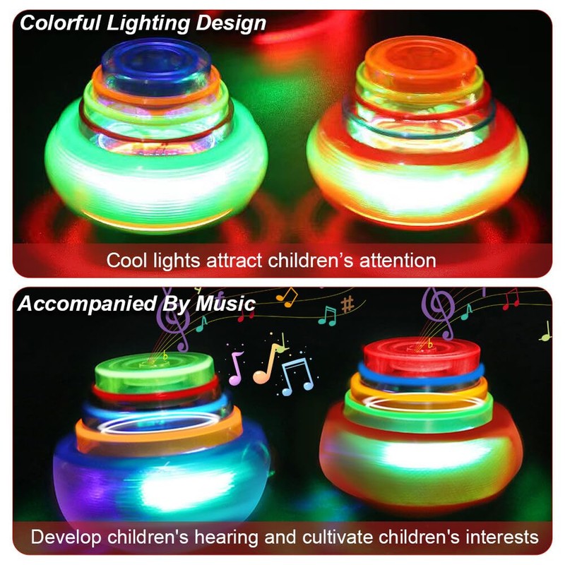 - Fun & Novelty Toys For Kids: Spinning top is one of the most classic toys in the past. And even today, very hot and popular among kids.Light up spinning toy helps to exercise childrens cognitive skills and hand- eye coordination, it will foster your kids creativity physics/kinesthetic and fine motoric skills. Kids will love these light up spinning tops with colorful flashing and fun sound effect, you can accompany your little ones to play this rotating toy to strengthen the bond.