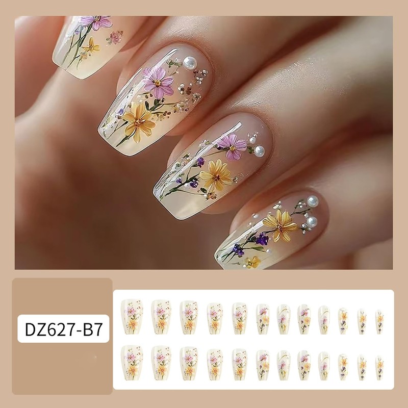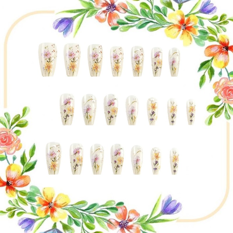 - Fake Nails Design: Our artificial nails use purple flowers , yellow flower, white pearl design, fashion and simple design style, give you spring feeling, pretty and comfortable press on nails will give you good mood and add luster to you