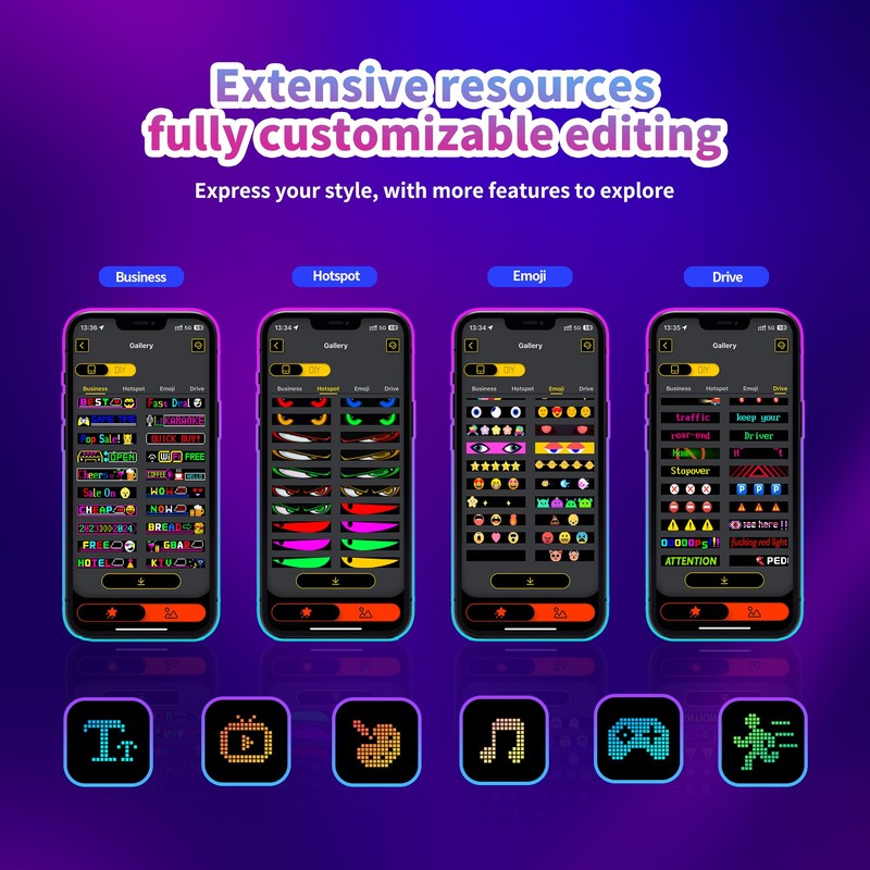 - UNLEASH YOUR CREATIVITY: Go far beyond pre-set animations with powerful app control. Design custom scrolling text for business or fun, draw unique patterns, upload your own GIFs, or even sync the lights to your music. These LED lights for your car are your personal, moving digital billboard.