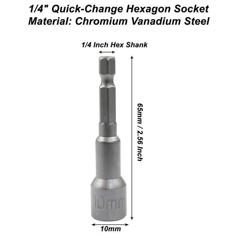 - ✿Versatile Set: The set includes 2 x hexagon socket in same sizes. Size: 10mm Nut Driver, Overall Length: 65mm. Universal 1/4" hex shank fits a variety of quick-change chucks and drill, driver, or screw-gun.