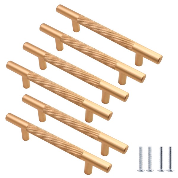 - ✿T Bar Kitchen Cabinet Handles: Package contains 6 x t bar kitchen cupboard handles with mounting screws, Colour: Gold, Design: Knurled, Overall Length: 150mm / 5.9 inch, Height: 32mm / 1 1/4 inch, Bar Diameter: 12mm / 0.47 inch, Center to Center: 96mm / 3 3/4 inch. Each wardrobe door handles pack separately to avoid damage.