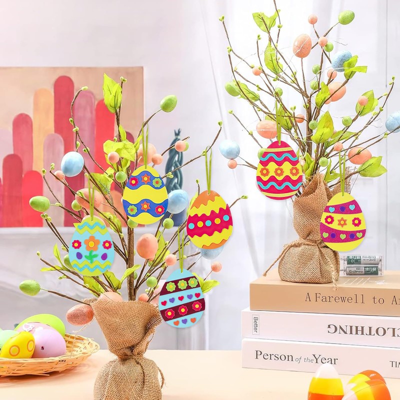 - [How to Assemble]: Each Easter Egg Craft Kit includes foam templates, self-adhesive foam ornaments, and hanging ribbon. Paste the bubble according to the shape of the Egg, it is very simple .No glue required! use the ribbons to hang on trees, door, windows for Easter Day decoration.