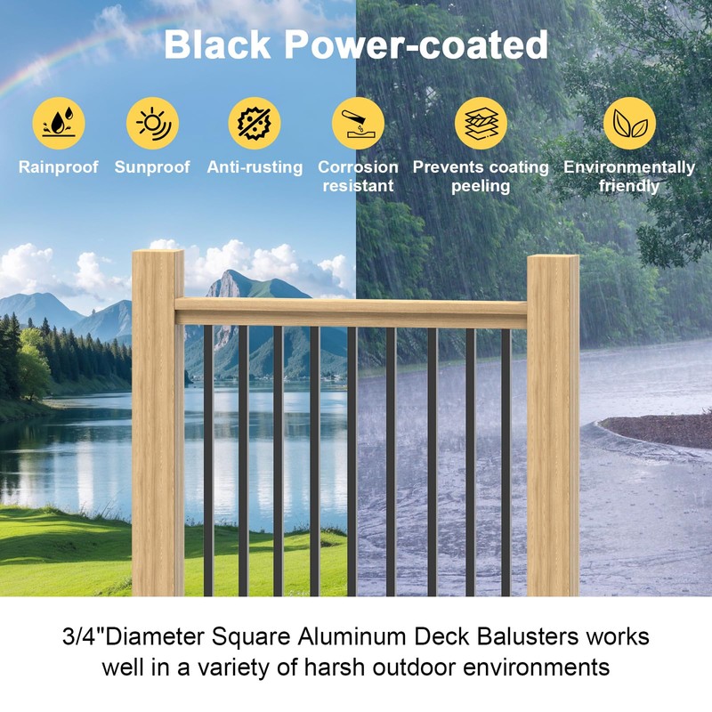 - 【Aluminum square deck spindles】: Our balusters for deck railing are made of high-quality aluminum, the square aluminum deck balusters use for the Black Power-coated coating technology, the deck spindles have waterproof, rust-proof, corrosion-resistant, etc., can be used outdoors for a long time, safety is guaranteed at the same time, the deck railing system of the maintenance cost is extremely low.