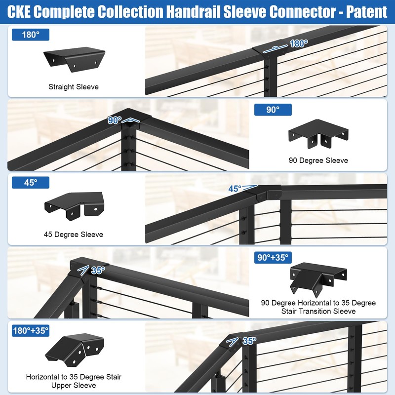 - 【Complete Hardware & Configurable】1 pack Handrail Connector Horizontal to 35 Degree Stair Upper Sleeve and all necessary hardware (8 Screws + Self-Tapping Screw + Drill Bit ) is included. This sleeve connector allows for unlimited deck configurations and works seamlessly with matching CKE black cable railing kits and accessories to achieve your desired railing system design. CKE complete selection of aluminum handrail connectors: Straight Sleeve, 90 Degree Sleeve, 45 Degree Sleeve, 90 Degree Horizontal to 35 Degree Stair Transition Sleeve, Horizontal to 35 Degree Stair Upper Sleeve