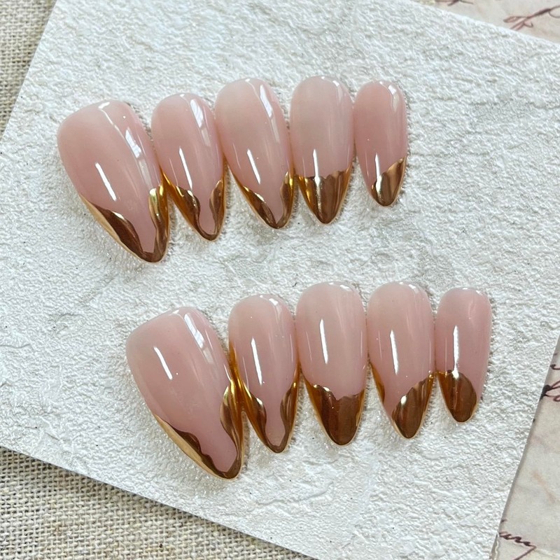 - Nail Design: Gold French Tip Short Almond Nails - a trend-driven, elevated twist to traditional french tips, this design stands out with metallic pink chrome tips you'll love to dress up or down. Plus, the short almond shape is great to elevate your everyday style.