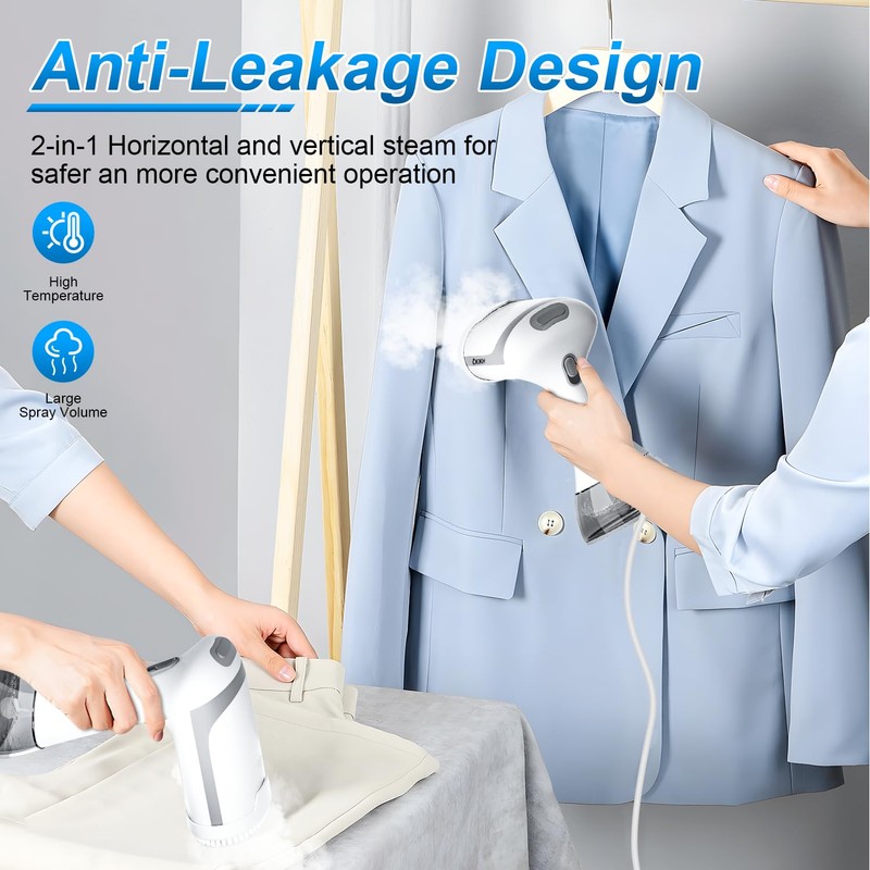- đ»ă360° Leak-Proof DesignăThis clothes steamer features a tight leak-proof design, so you don't have to worry about leaks whether you're steaming horizontally or vertically, making it easier for you to steam your clothes.