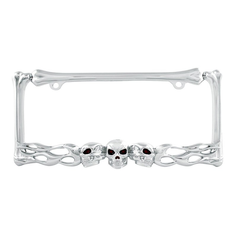 CLA Flaming Skull Metal License Plate Frame - Chrome