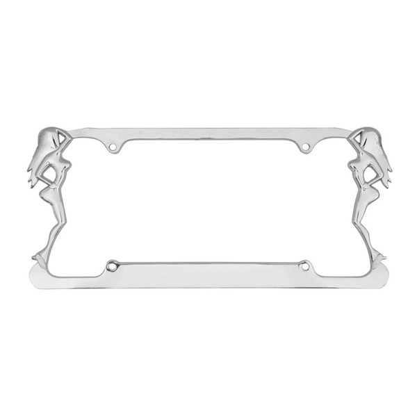 Customize your license plate with our chrome license plate frame. This quality frame is made out of metal and polished with a chrome finish for optimal style. It also features a 3D silhouette of twin ladies standing on each side of the frame. Just use the screws from your license plate to secure the license frame onto your vehicle for a completed look.