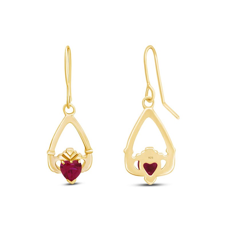 Claddagh Drop Simulated Ruby Earrings In Yellow Gold Over Sterling Silver By jewel Zone US