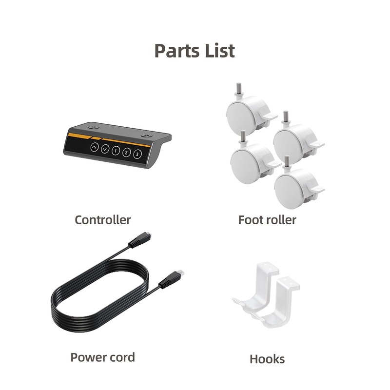 2. Worry-free Usage: We have provided you with a comprehensive set of accessories for immediate use, including Control Panel (x1), Power Supply (x1), A screw kit, Foot Pads&Casters (x4), and Hangers (x2).(Tabletop must be purchased separately)