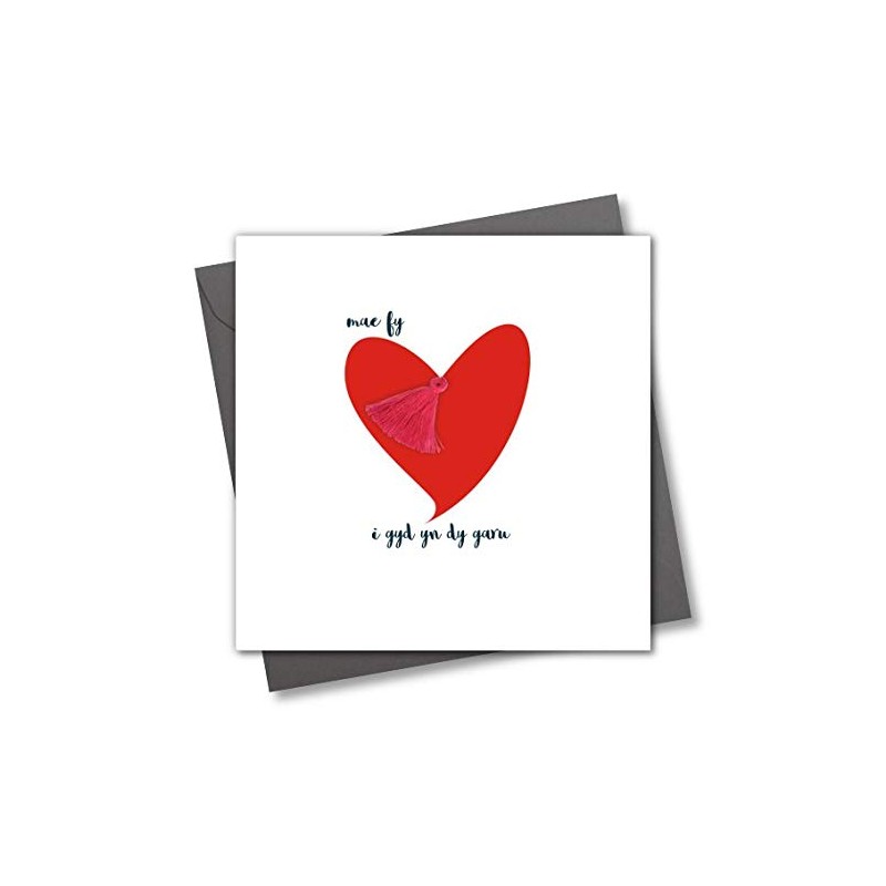 Claire Giles Welsh Language Valentine's St Dwynwen Card, WVTA012, I Love You with All My Heart, Greeting Card Embellished with a Tassel