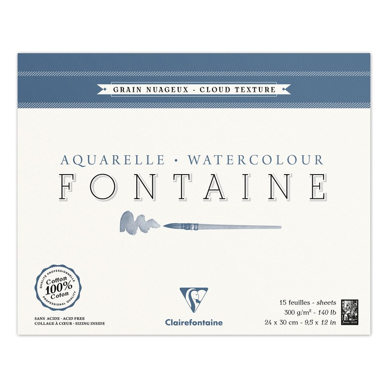 Clairefontaine - Ref 96421C - Fontaine Cloud Texture Watercolour Glued Pad (15 Sheets) - 24 x 30cm Size, 300gsm Paper - Suitable for Watercolour Artwork