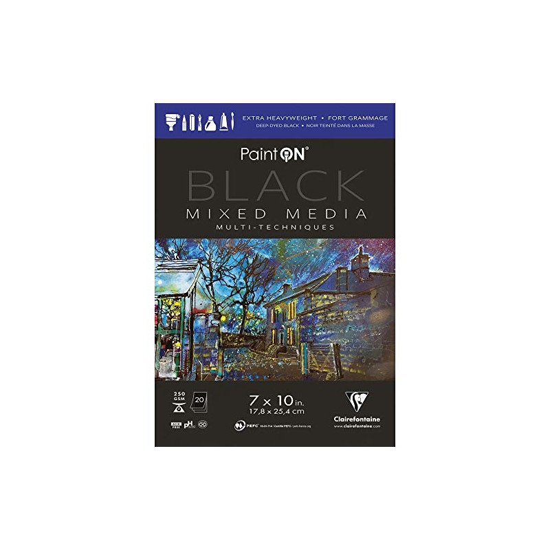 Clairefontaine - Ref 975490C - Paint'ON Mixed Media Black Glued Pad (20 Detachable Sheets) - 22.29 x 30.5cm (9 x 12in), 250gsm Heavyweight Paper (USA Version)