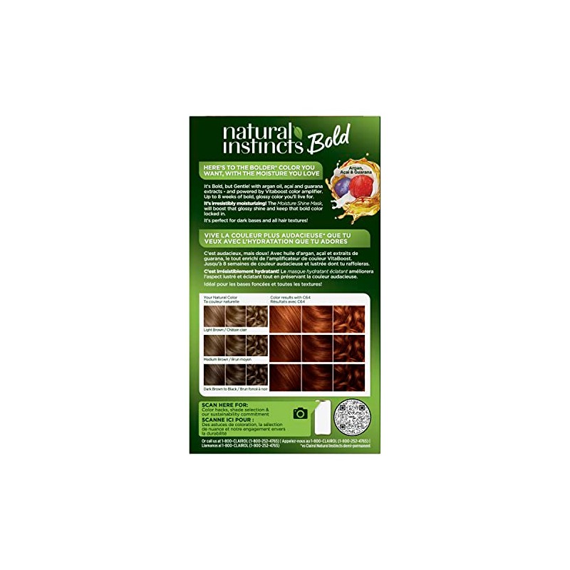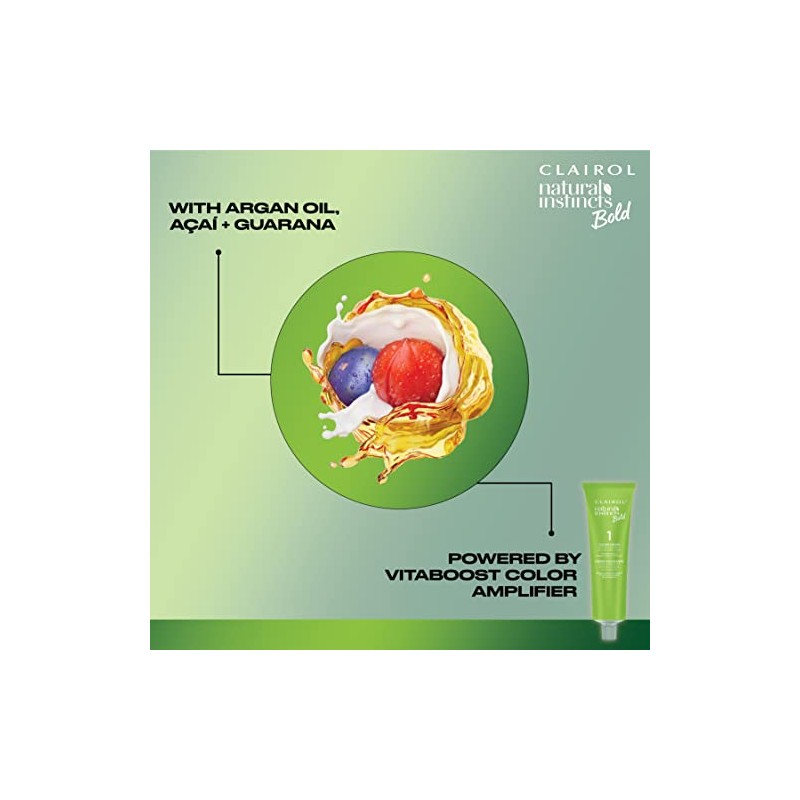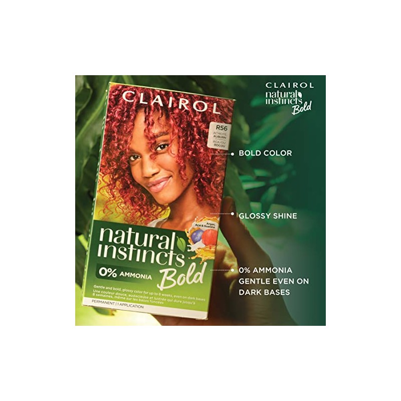 GENTLE AND BOLD, GLOSSY COLOR FOR UP TO 8 WEEKS, EVEN ON DARK BASES. Here's to the bolder color you want, with the moisture you love! Clairol Natural Instincts Bold Permanent gives you gentle and bold, glossy color for up to 8 weeks, even on dark bases. With argan oil, açaí and guarana extracts and VitaBoost Color Amplifier, get smooth & moisturized hair with bold color. 0% ammonia, and no animal derived ingredients. It's ideal for dark bases and all hair types & textures.