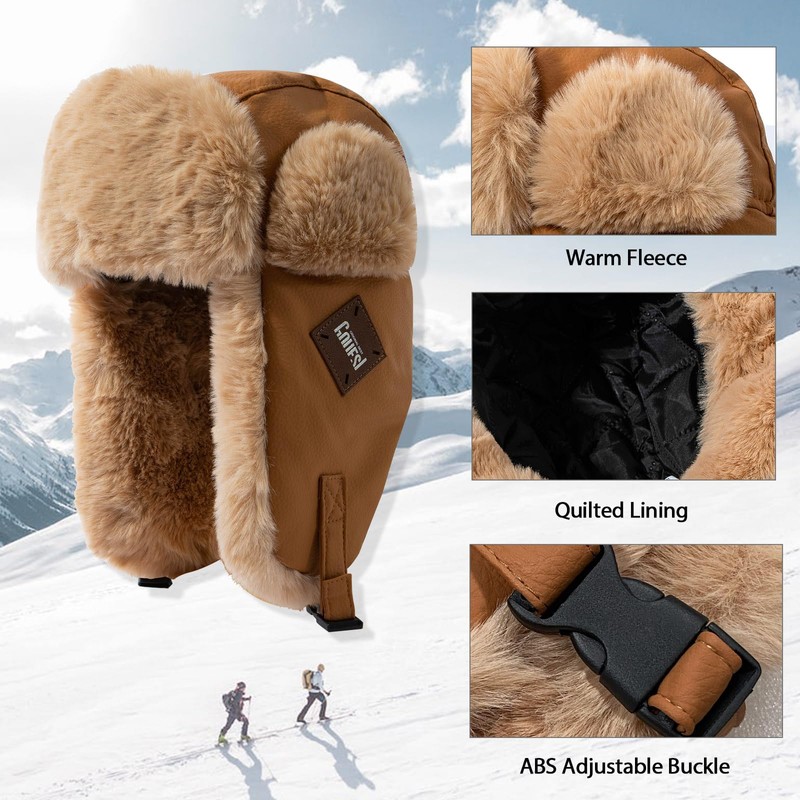 - The Russian leather hat can block wind, water and snow, and at the same time it is equipped with faux fur and cotton polyester with excellent heat effect, which is very warm. Fearless of snowy weather, it offers you high-quality warmth and protection in cold days, which is comfortable for you to travel and brings you a better wearing experience.