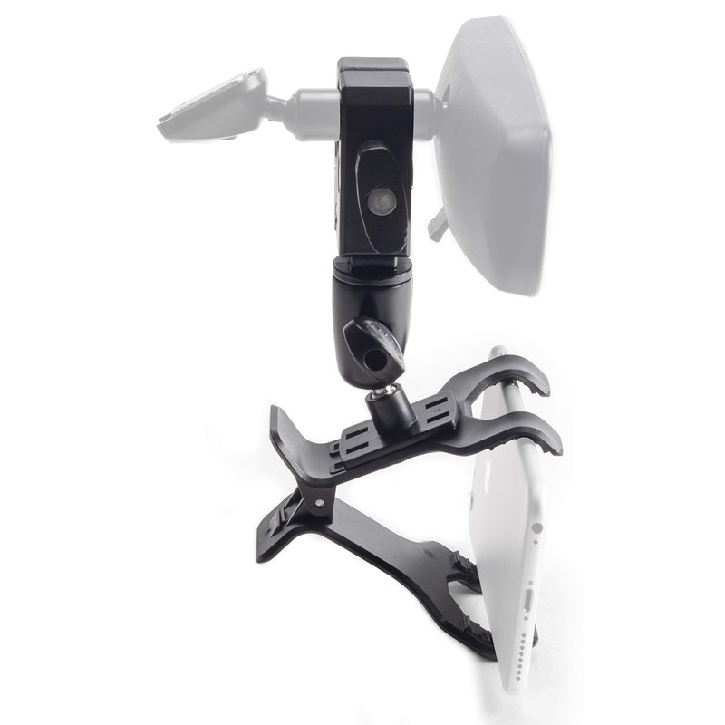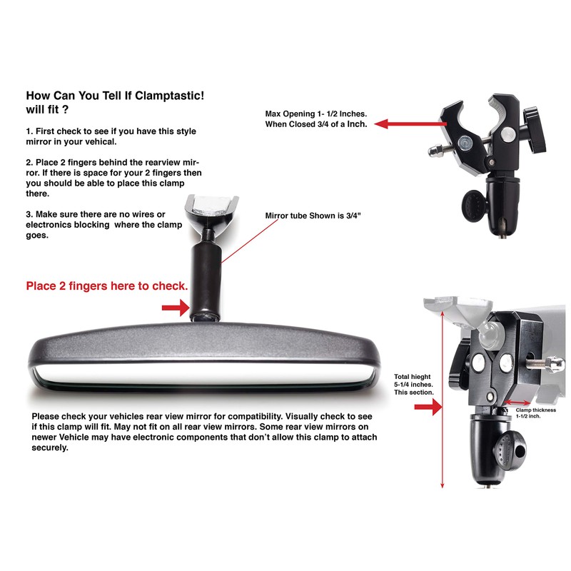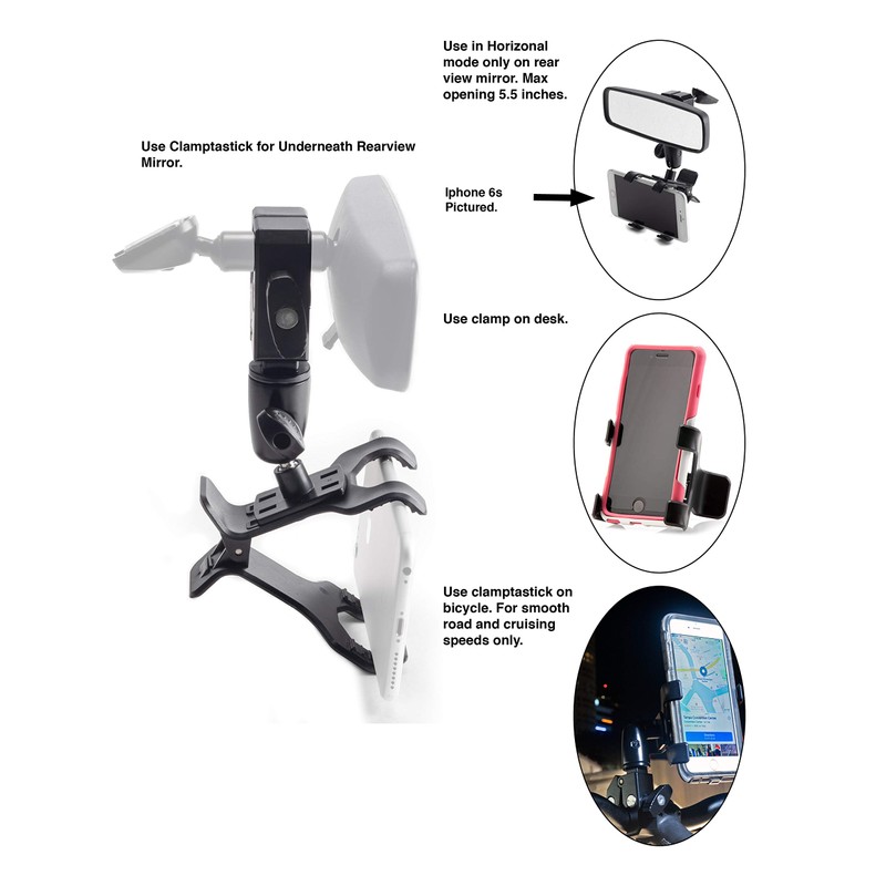 - *****( Works in Horizontal mode ONLY on rear view mirror)***** Clamptastick is a large lightweight heavy-duty clamp that holds your phone in one place. Now you can finally release your phone in one second with just a quick squeeze.