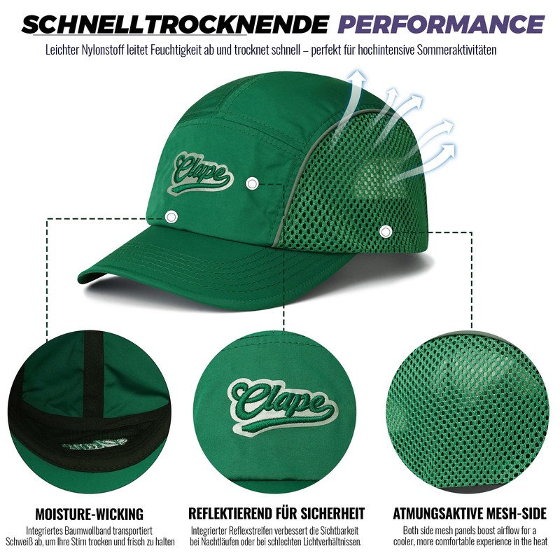 - Reflective safety: integrated reflective strips on the baseball cap increase visibility at night. Embroidered 'Clape' logo with reflective underlay for subtle visibility of this running cap