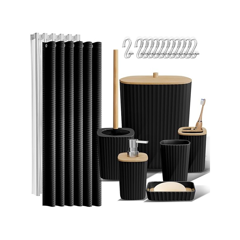 Included Components:Shower Curtain, Shower Curtain Liner, 12 Shower Curtain Hooks, Toothbrush Holder, Soap Dish, Soap Dispenser, Tumbler, Toilet Brush, Trash Can