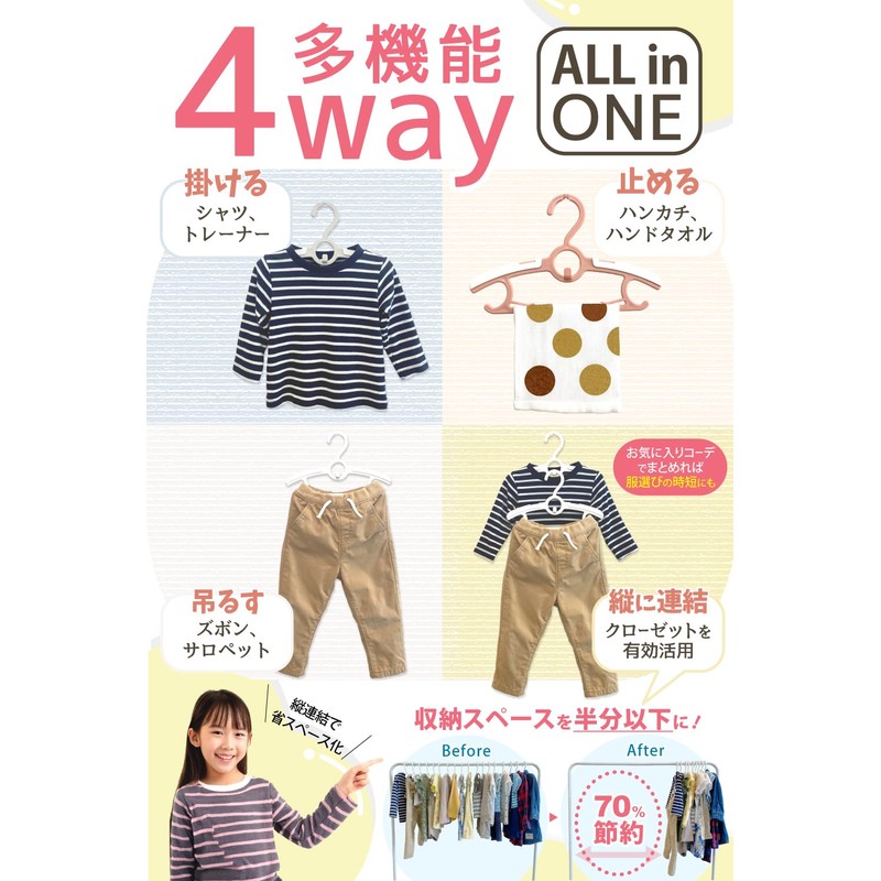 - All-in-one. Extendable 4-Way Multi-functional Hanger: The shoulder slider can be adjusted in 4 different levels (11.0 - 14.6 inches (28 - 37 cm)), so you can use it with "baby, kindergarten, elementary school, middle school, high school, college" and "no need to buy anymore. Since there are many hanging places, you can also use items such as shirts, pants, overalls and gauze towels, socks, etc. Convenient 4-way multi-functional hanger for hanging, hanging, stopping and connecting