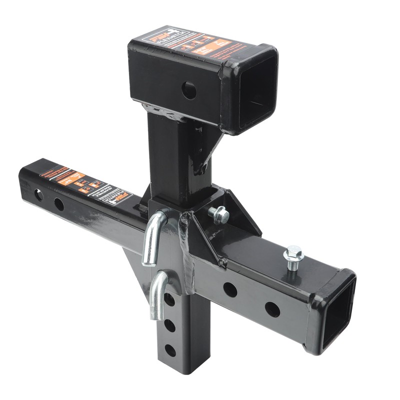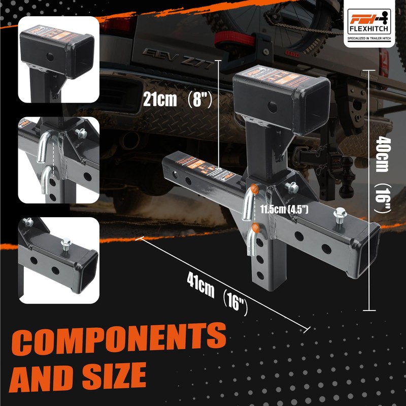 - Adjustable Extender Receiver – Equipped with a standard 2-inch receiver with adjustable height and extends outward by 6 inches (the actual extension is approximately 5 inches after the trailer arm is inserted). Simply put your trailer arm into it, and the dual latches ensure a tight fit with your trailer hitch