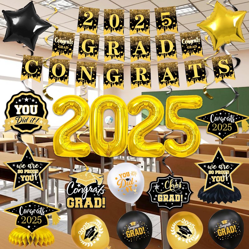 - Unique Design College Graduation Decorations 2025 : The class of 2025 decorations set of graduation in exquisite black and gold colors incorporates classic college and graduation patterns, as well as inspirational slogans such as "2025 GRAD" and "Congrats," each design has been carefully polished. Arrange graduation centerpieces for tables, and let the swirling ceiling decor add atmosphere