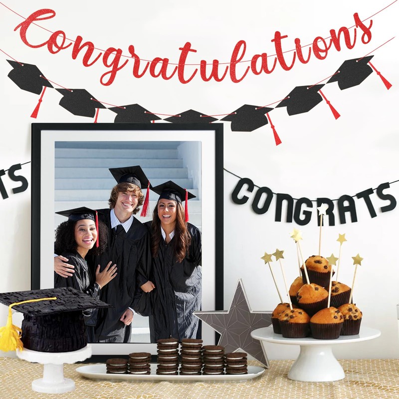 Features: pre-strung congratuations banner, glitter congratuations banner graduation party supplies