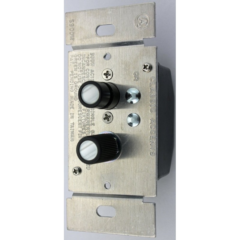 Narrow version of our Single Pole Dimmer Switch the S90DM6. Heat displacement plate is trimmed down so you can install this dimmer next to another trimmed dimmer. Incandescent Light Dimmer for Permanent Fixtures. This dimmer will work with dimmable CFL's and new LED light bulbs. (DO NOT USE ON FLUORESCENT FIXTURES OR FANS.) The modern convenience of a dimmer switch in the Classic styling of Push Button design. The external parts of the Push Button Dimmer are almost indistinguishable from the standard Push Button Switch. The top button pushes in and serves as an on-off function. The bottom button rotates to increase or decrease intensity. 400 Watts - 120 Volt