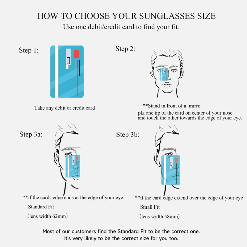 - How to Choose Your Size - Each color is divided into two sizes, small and medium, and the lens width is 58mm and 62mm respectively. If you don't know how to choose the size you want, you can take out a credit card and follow the operation method shown in the picture, you can choose the correct one size.