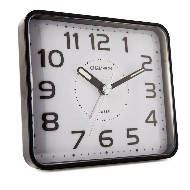 Classic Bold Traditional Black Square Quartz Sweeping Non Ticking Alarm Clock with Flashing Back Light and Bleep Alarm.