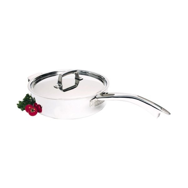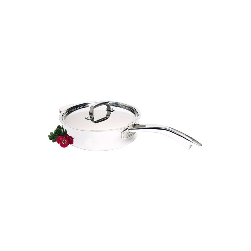 Designed with straight, relatively high sides and a helper handle for added support, this large five-quart covered sauté pan is ideal for braising meats, adding potatoes and other ingredients, and sautéing onions without splatter. Clad in gleaming stainless steel, the pan is constructed with an inner core of aluminum across the bottom and up the sides for even, efficient cooking at low temperatures. The long handle, riveted for strength and curved for comfort and control, stays cool thanks to its hollow design and V-connection, and features a generous hole for hanging. Whisks, spoons, and cleaning brushes all glide smoothly along the curved inner contour of the pan, and the lid fits snugly on the flared, easy-pour rim.