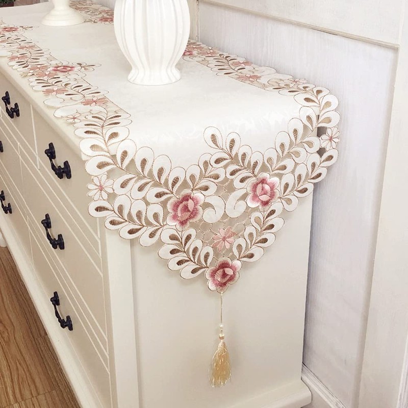- Elegant lace runner in cream with embroidery light pink flower; features cutwork details with intricate lace design and matching tassel.