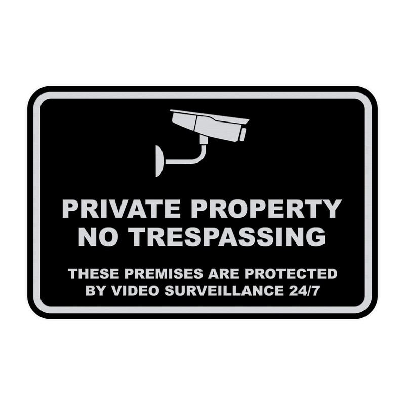Our Classic Framed Private Property No Trespassing These Premises are Protected by Video Surveillance 24/7 Sign can be attached to the door, wall or window of your home or business. The sign text and design work is laser engraved into sturdy plastic. Each sign comes with an adhesive foam backing, allowing them to be attached to any flat surface. Comes in multiple colors. Our no trespassing signs are great for your home or business. Medium sign is 5"H X 7" W