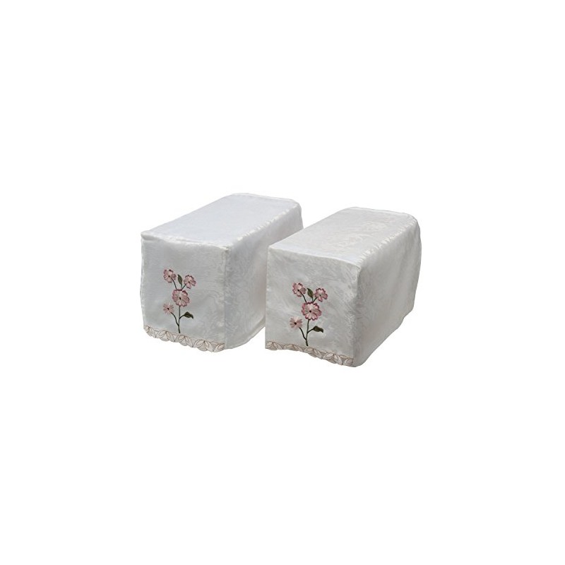 Classic Home Store Traditional White Macrame Square Arm Cap Pair with Embroidered Pink Floral Detail & Leaf Style Trim